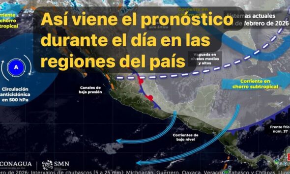México, 22 feb. 2026.-Este día, el frente frío número 37 recorrerá el oriente y sureste de México, así como la península de Yucatán, originando chubascos y...
