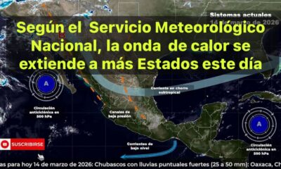 México,14 marzo 2026.-Este día, canales de baja presión en el interior del país, inestabilidad atmosférica y el ingreso de humedad, generarán lluvias y chubascos en el...