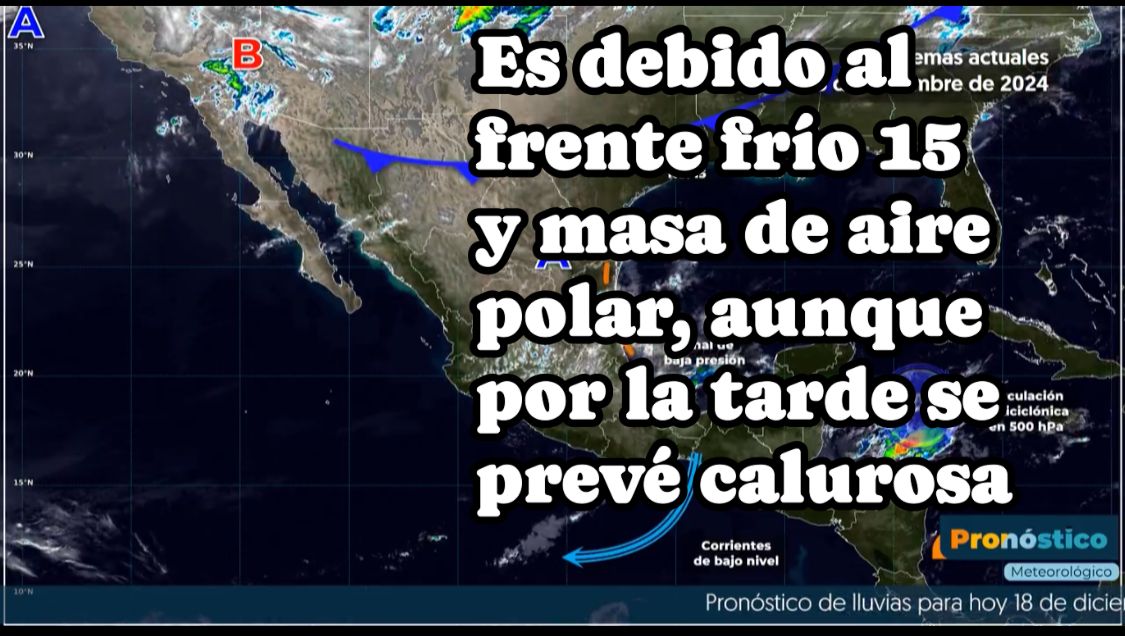 México,18 diciembre 2024.-Para hoy, el frente frío No. 15 que será reforzado por una masa de aire polar, se desplazará sobre el norte y noreste de México y originará lluvias puntuales fuertes en Tamaulipas; y chubascos en Coahuila y Nuevo León.