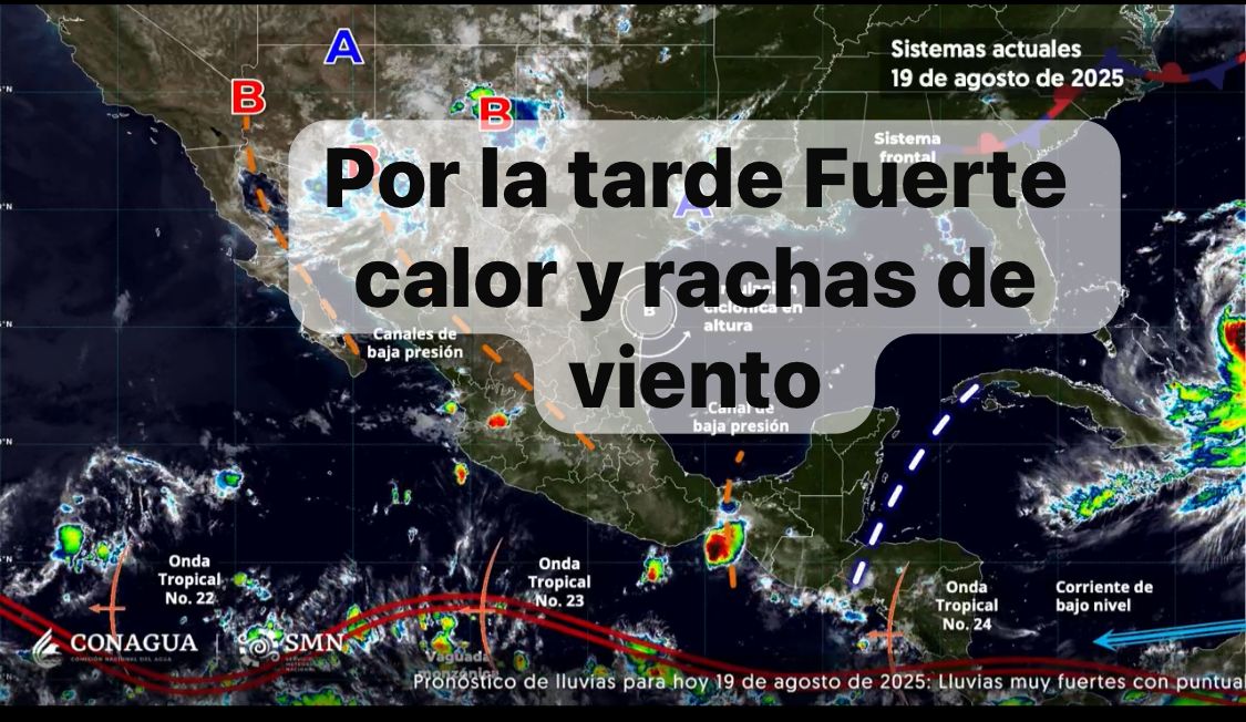 México,19 agosto 2025.-Para hoy, el monzón mexicano en interacción con inestabilidad atmosférica, ocasionará lluvias puntuales muy fuertes en Sinaloa, Sonora y Chihuahua; puntuales fuertes en Nayarit y Durango; y lluvias con intervalos de chubascos en Baja California Sur, todas con descargas eléctricas.