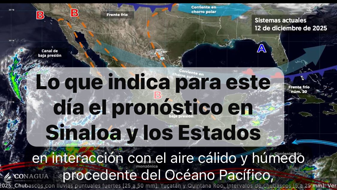 México, 12 dic. 2025.-Este día, canales de baja presión en el interior del país, en interacción con el aire cálido y húmedo procedente del océano Pacífico, golfo de México y mar Caribe, mantendrá las condiciones para lluvias y chubascos con descargas eléctricas y posible caída de granizo en los estados del occidente, centro, sur y sureste del territorio nacional, incluidos el Valle de México y la península de Yucatán, así como lluvias puntuales fuertes en Yucatán y Quintana Roo.