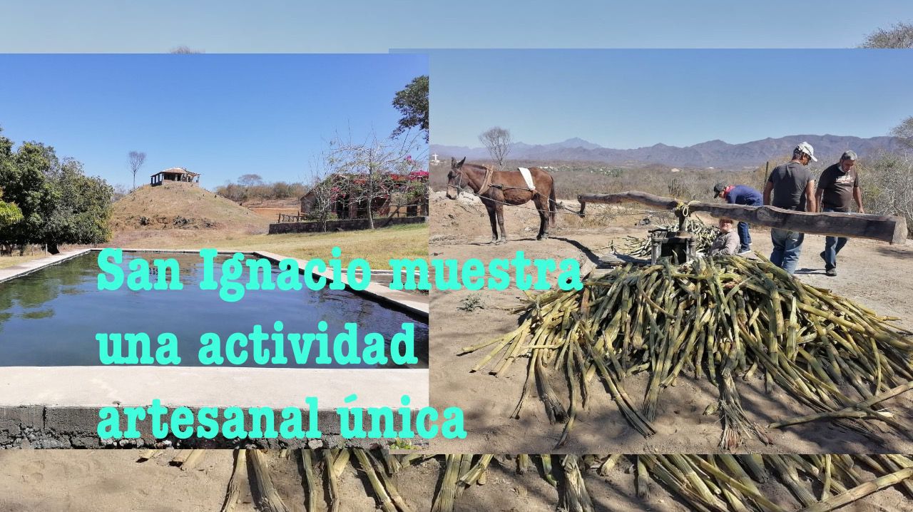 San Ignacio,Sinaloa.- En el predio del Agua Caliente, ubicado a la entrada de la cabecera municipal se realiza está actividad rústica, donde la caña de azúcar se coloca manualmente para que con la ayuda de una mula y un mecanismo rudimentario se tritura la caña para poder obtener el líquido que se le llama aguamiel.