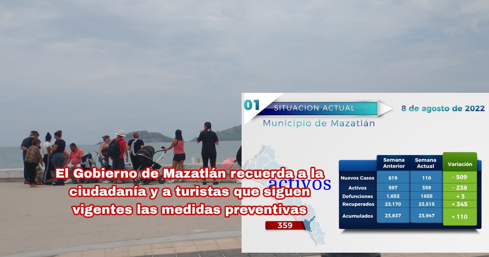 Mazatlán, Sinaloa; agosto 10 del 2022.-Los casos COVID en el puerto de Mazatlán continúan registrándose a la baja, según datos de la última actualización de la plataforma. El municipio registró 25.8 grados en el termómetro municipal COVID con 359 los casos activos en Mazatlán.