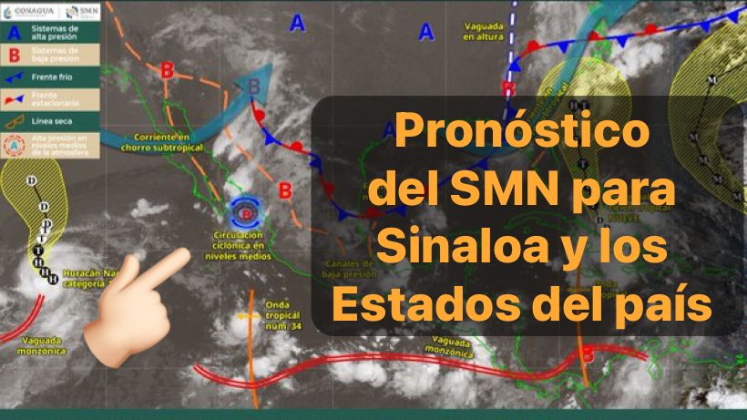México,27 sept, 2025.-Este día, una circulación ciclónica en niveles medios de la atmósfera sobre el sur del golfo de California y la corriente en chorro subtropical, mantendrán condiciones para lluvias fuertes a puntuales muy fuertes en Sonora, Sinaloa, Chihuahua, Durango y Zacatecas; así como chubascos en la península de Baja California.