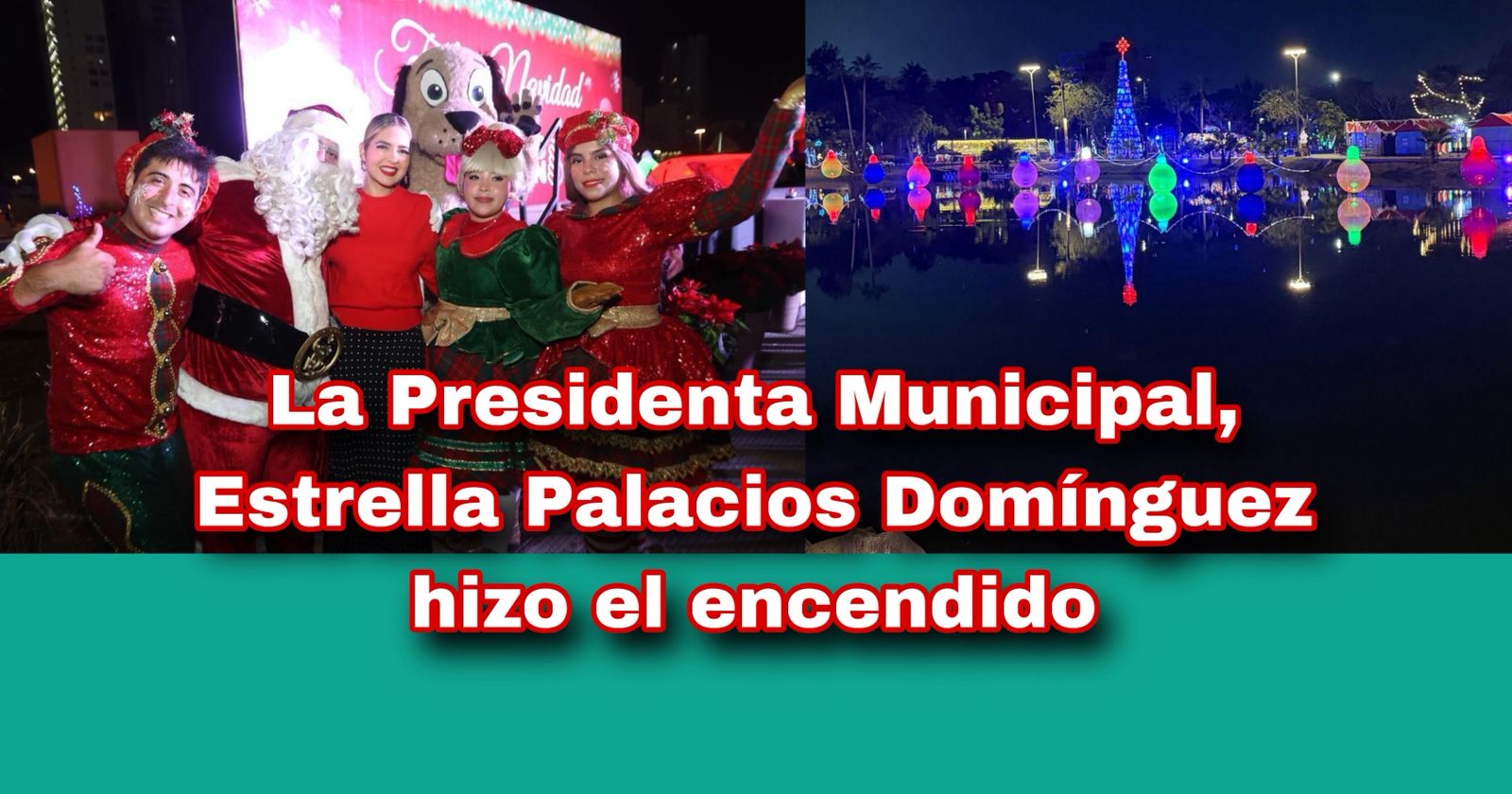 Mazatlán, Sin., 19 de dic. 2025.– La Presidenta Municipal, Estrella Palacios Domínguez, llevó a cabo la noche de este viernes el encendido de la iluminación e inauguración de la Villa Navideña en el Parque Central, convertido en Sendero de Paz, un espacio que permanecerá abierto al público de manera gratuita hasta el próximo 6 de enero de 2026.