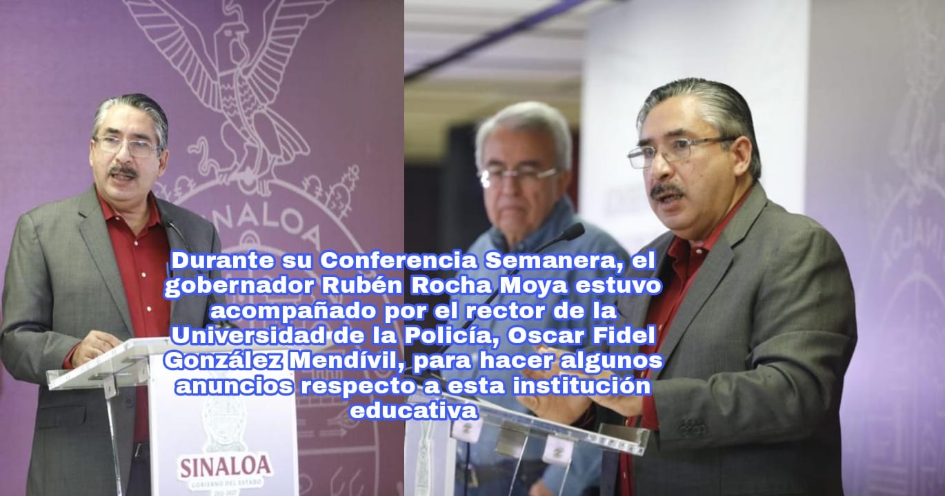 Culiacán.- Durante su Conferencia Semanera, el gobernador Rubén Rocha Moya estuvo acompañado por el rector de la Universidad de la Policía, Oscar Fidel González Mendívil, para hacer algunos anuncios respecto a esta institución educativa, entre ellos, la capacitación a policías de Nayarit, la ampliación de sus instalaciones, y el acuerdo de su Junta Directiva de otorgar becas a los hijos de los policías caídos en el cumplimiento de su deber, a policías jubilados, y también para elementos que se encuentren en activo en la Policía, esto en reconocimiento a estos servidores públicos y como una medida de apoyo.