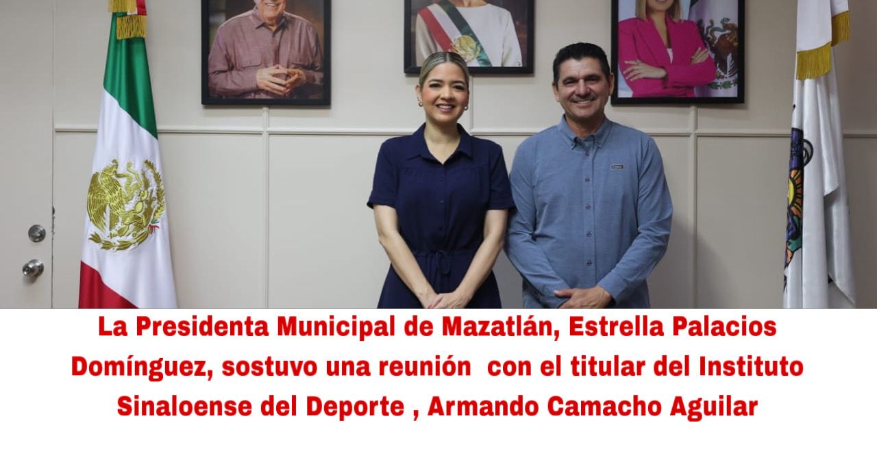 Mazatlán, Sin., 22 dic. 2025.– Este lunes, la Presidenta Municipal de Mazatlán, Estrella Palacios Domínguez, sostuvo una reunión con el titular del Instituto Sinaloense del Deporte (ISDE), Armando Camacho Aguilar, con el objetivo de establecer una agenda conjunta que permita el desarrollo de diversas actividades deportivas en Mazatlán, fortaleciendo la sinergia entre el Gobierno Municipal y el Gobierno del Estado.