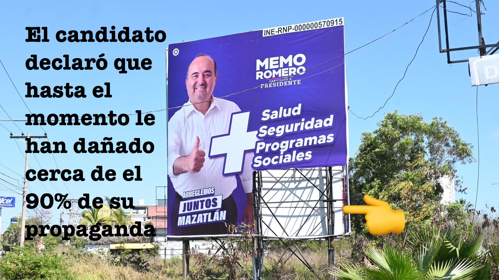 Mazatlán, 17 de mayo de 2024- Con más del 90% de su publicidad destruida, Memo Romero, candidato a la alcaldía de Mazatlán por la Coalición Fuerza y Corazón por Sinaloa, denunció hoy la aparición de un espectacular severamente dañado y cortado, ubicado en la avenida Reforma cerca de una conocida plaza comercial, a pesar de ser una zona de alto tránsito.