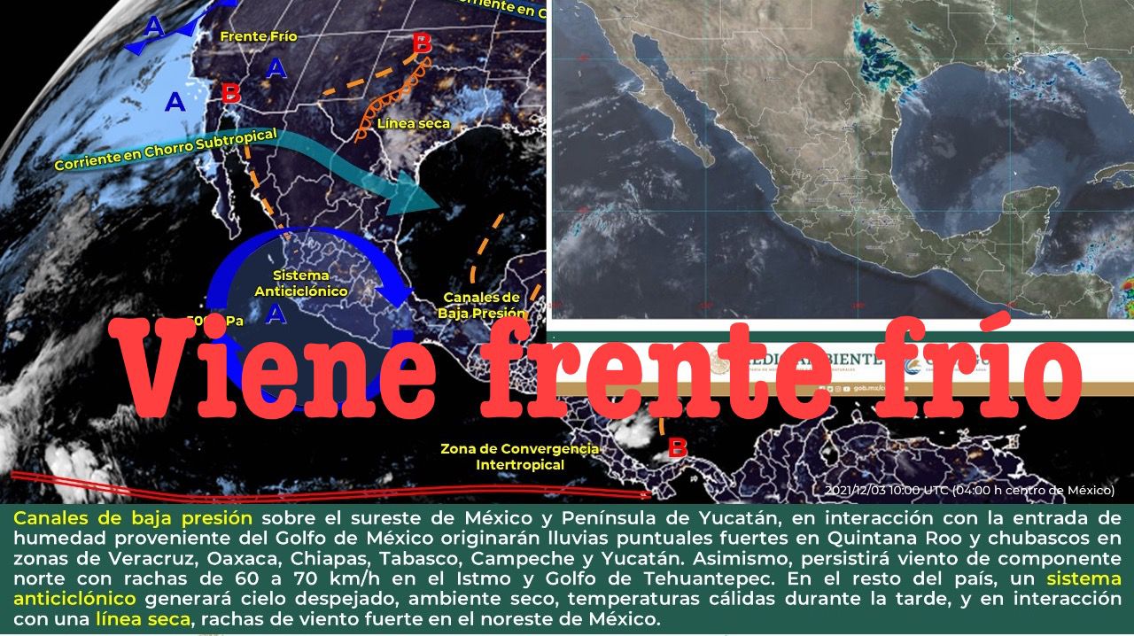 Ciudad de México, a 03 de Diciembre del 2021.-Para el día de hoy, canales de baja presión sobre el sureste de México y Península de Yucatán, en interacción con la entrada de humedad proveniente del Golfo de México mantendrán las condiciones para lluvias puntuales fuertes en Quintana Roo y chubascos en zonas de Veracruz, Oaxaca, Chiapas, Tabasco, Campeche y Yucatán.