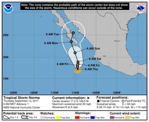 Se trata de la tormenta Tropical Norma que presenta vientos sostenidos de 65 kilómetros por hora.