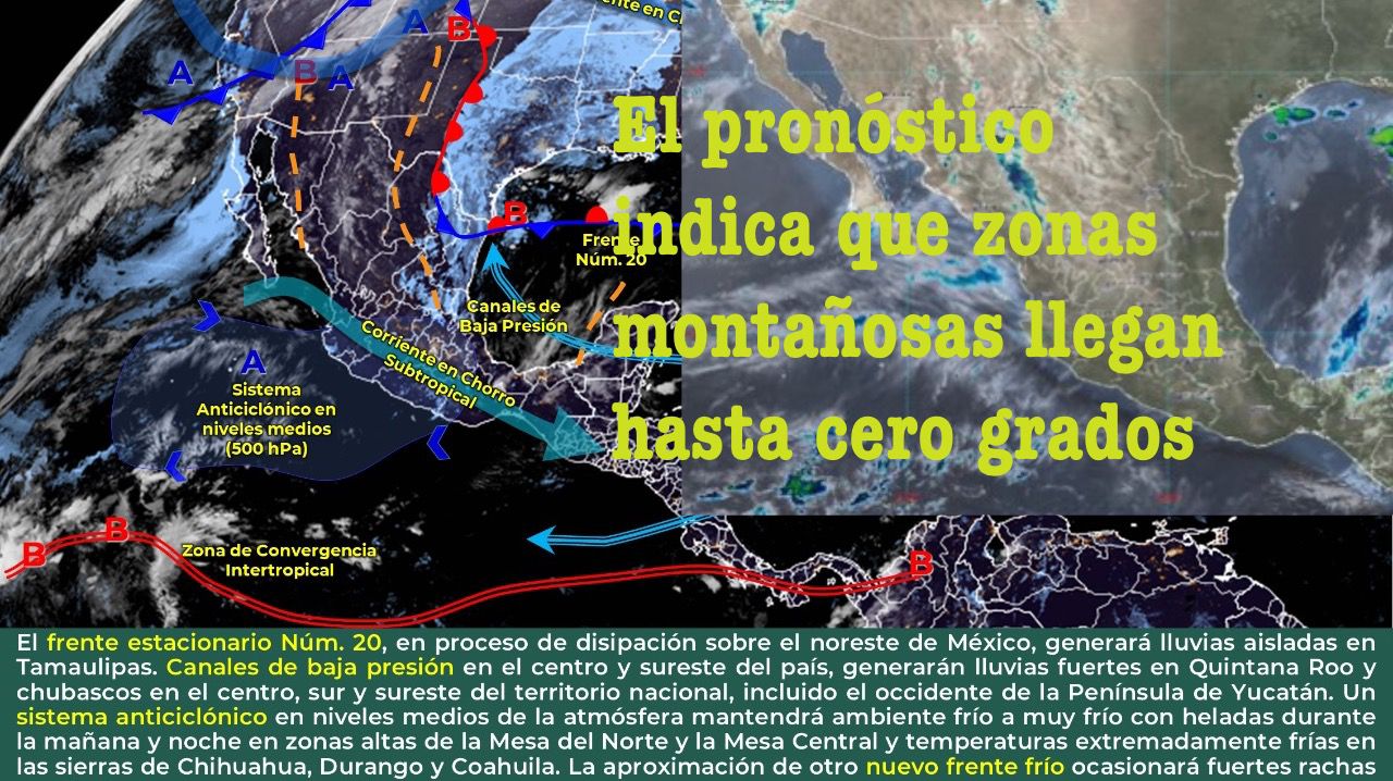 Por otro lado, persistirá un sistema anticiclónico en niveles medios de la atmósfera, manteniendo tiempo estable con ambiente vespertino cálido a caluroso y con escaso potencial de lluvia sobre el noroeste, norte y occidente de México, así como ambiente frío a muy frío durante la mañana y noche y con probabilidad de heladas matutinas en zonas altas de la Mesa del Norte y la Mesa Central, además de temperaturas extremadamente frías en localidades de las sierras de Chihuahua, Durango y Coahuila.