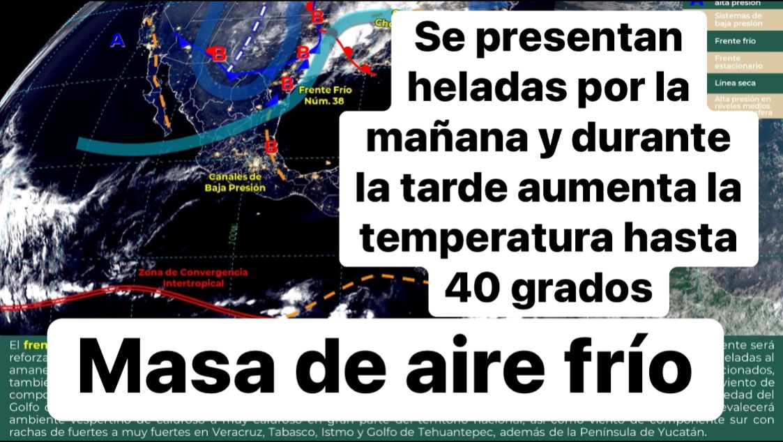 Asimismo, la masa de aire frío que impulsa al frente será reforzada e interaccionará con las corrientes en chorro polar y la subtropical, manteniendo el ambiente frío a muy frío con heladas al amanecer en el norte del país, siendo el ambiente gélido en zonas altas de Chihuahua y Durango.