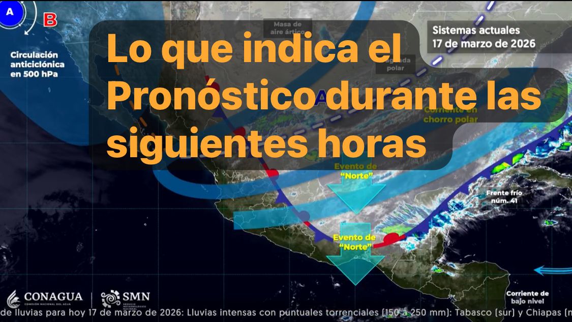 México, 17 marzo 2026.-Para hoy, el frente frío número 41 se desplazará sobre la península de Yucatán, ocasionará lluvias muy fuertes a intensas en dicha península, así como en el sureste mexicano, pronosticándose lluvias puntuales torrenciales en Tabasco (sur) y Chiapas (norte).