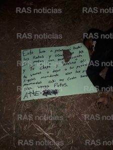 La leyenda escrita en una cartulina de colore blanco va dirigida a los rateros y asaltantes y se menciona que eso mismo les va a pasar a todos; menciona dos nombres.