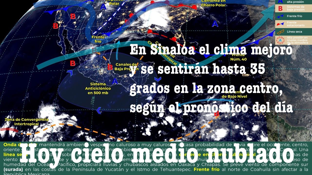 Pacífico Norte: Cielo con nubosidad dispersa y sin lluvia en la región. Ambiente matutino frío a fresco con heladas sobre sierras de Sonora. Por la tarde, ambiente cálido a caluroso. Viento del sur y suroeste de 10 a 25 km/h.