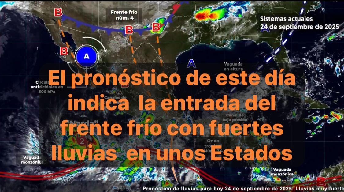 México,24 sept. 2025.-Para hoy, el monzón mexicano ocasionará lluvias puntuales intensas en Nayarit; puntuales muy fuertes en Sinaloa; puntuales fuertes en Sonora y Durango; chubascos en Baja California Sur y lluvias aisladas en zonas de Baja California.