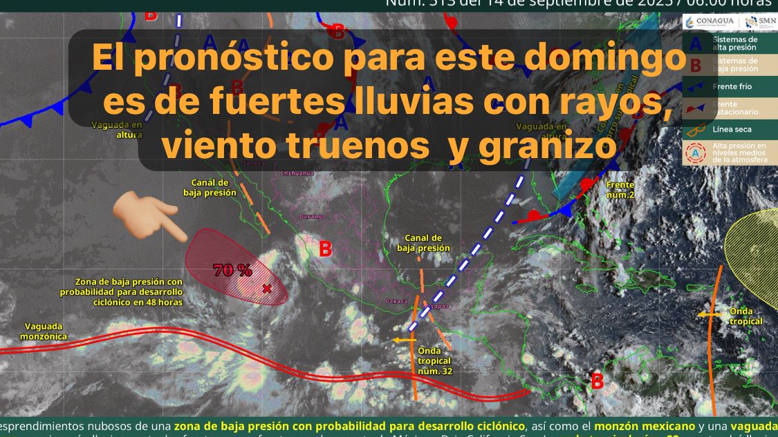 México, 14 sept. 2025.-Para hoy, los desprendimientos nubosos de una zona de baja presión con probabilidad para desarrollo ciclónico al sur de la península de Baja California, así como el monzón mexicano sobre el noroeste del país, ocasionarán lluvias puntuales muy fuertes en Nayarit, Sinaloa y Durango; y puntuales fuertes en Chihuahua, Sonora y Baja California Sur.