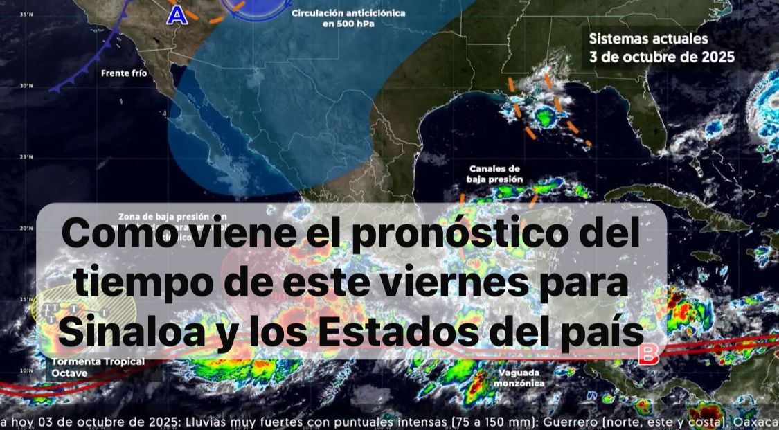 México, 3 Oct. 2025.-Este día, una zona de baja presión con probabilidad para desarrollo ciclónico o posible ciclón tropical, se localizará al sur de las costas de Michoacán y Colima, en interacción con la vaguada monzónica que se extenderá próxima al Pacífico Sur y Central Mexicano, generarán lluvias puntuales intensas en Guerrero (norte, este y costa) y Oaxaca (oeste, norte, y sur); así como lluvias fuertes a muy fuertes en el occidente de la República Mexicana.