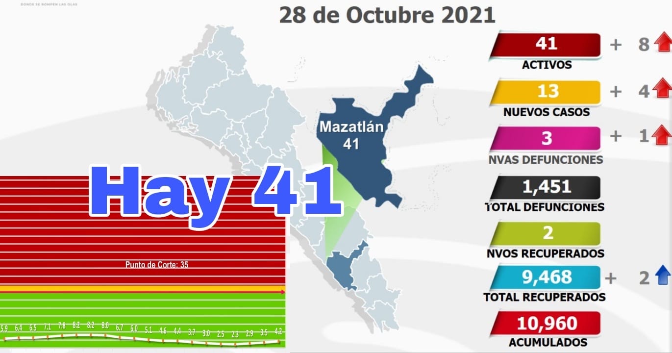 Este viernes, Mazatlán amaneció con 41 casos activos de Covid-19 y se mantiene en color verde del Semáforo Epidemiológico Estatal y del Termómetro del Ayuntamiento, que se ubicó en los 4.2 grados Covid.