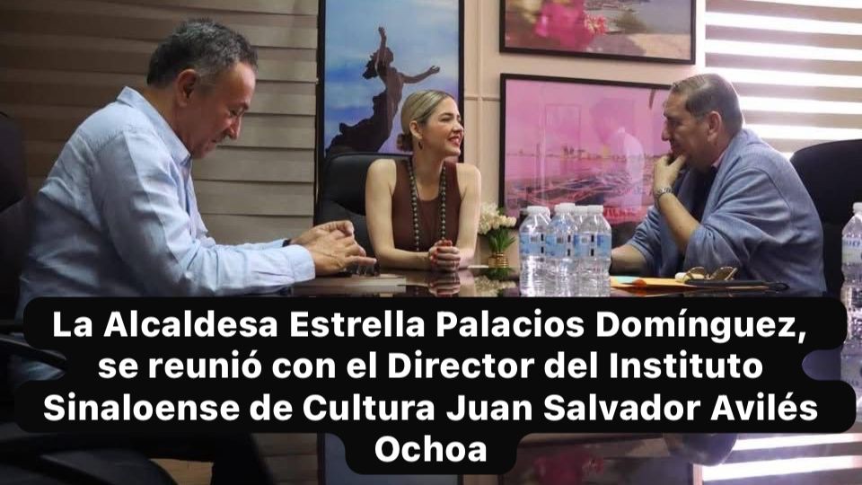 Mazatlán, Sin., 6 marzo 2026.- Con el propósito de fortalecer la promoción cultural y acercar el arte a más espacios de Mazatlán, la Presidenta Municipal, Estrella Palacios Domínguez, sostuvo una reunión de trabajo en su despacho con el Director General del Instituto Sinaloense de Cultura (ISIC), Juan Salvador Avilés Ochoa; el Director de Programación del ISIC, Rodolfo Arriaga Robles; y el Director del Instituto Municipal de Cultura, Turismo y Arte de Mazatlán, Óscar García Osuna.