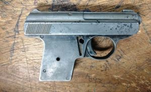 Ahí se localizó y aseguró un arma tipo pistola color gris calibre 25 con la leyenda “Regin Miami” sin cargador.