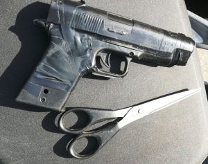 En la cintura le encuentran fajada, una pistola (plástico), así como unas tijeras que traía en la bolsa del pantalón. Ambas son aseguradas.