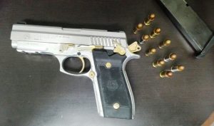 En la cintura derecha, se le encuentra fajada una pistola calibre 38 súper con 9 cartuchos útiles en el cargador y uno en la recámara, por lo que se procede a su detención.