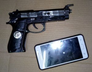 Metros más adelante, los efectivos de la SSPM le dieron alcance al acusado y al notificarle del señalamiento en su contra se le realizó una inspección corporal. Los policías le hallaron el arma fajada en la cintura y el celular de marca Samsung en la bolsa derecha delantera de su pantalón.