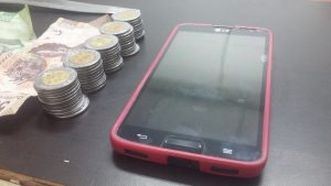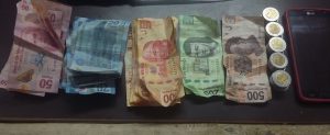 Ante el señalamiento se le realizó una inspección preventiva, localizándole el cuchillo de cocina de aproximadamente 30 centímetros fajado en la cintura por el lado de la espalda, además se le aseguró un total de 2 mil 805 pesos en efectivo y un teléfono celular marca LG de color negro con funda rosa, propiedad de la afectada. Todo fue reconocido por la víctima.