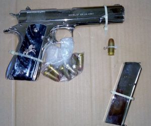 Las pistolas aseguradas son una escuadra marca Colt calibre .45 milímetros Modelo 1911 US Army color plata con cachas de plástico negras con la imagen de un caballo; la segunda arma es una pistola escuadra marca Colt calibre .45 con dos cartuchos en el cargador.