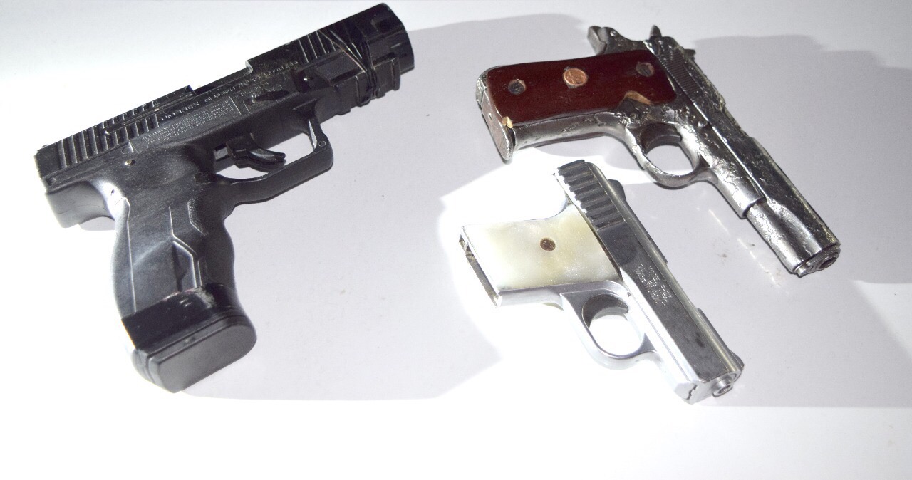 Las armas aseguradas son una pistola escuadra cromada calibre 380, una más de color negro calibre 25 milímetros y un arma tipo escuadra de color negro de utilería, armas con las que amenazaban a sus víctimas.