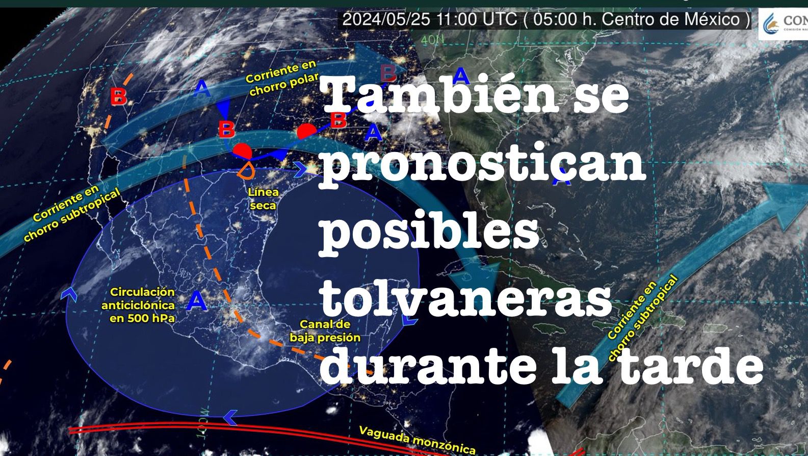 México,25 de Mayo del 2024.-Este sábado, se mantendrá una circulación anticiclónica en niveles medios de la atmósfera persistiendo la tercera onda de calor de la temporada sobre México, incluido el Valle de México, con temperaturas que podrían superar los 45° C en Sonora, Chihuahua (oriente), Sinaloa, Nayarit, Jalisco, Michoacán, Guerrero, Oaxaca, Morelos, Coahuila, Nuevo León, Tamaulipas, San Luis Potosí, Veracruz, Tabasco, Campeche y Yucatán.