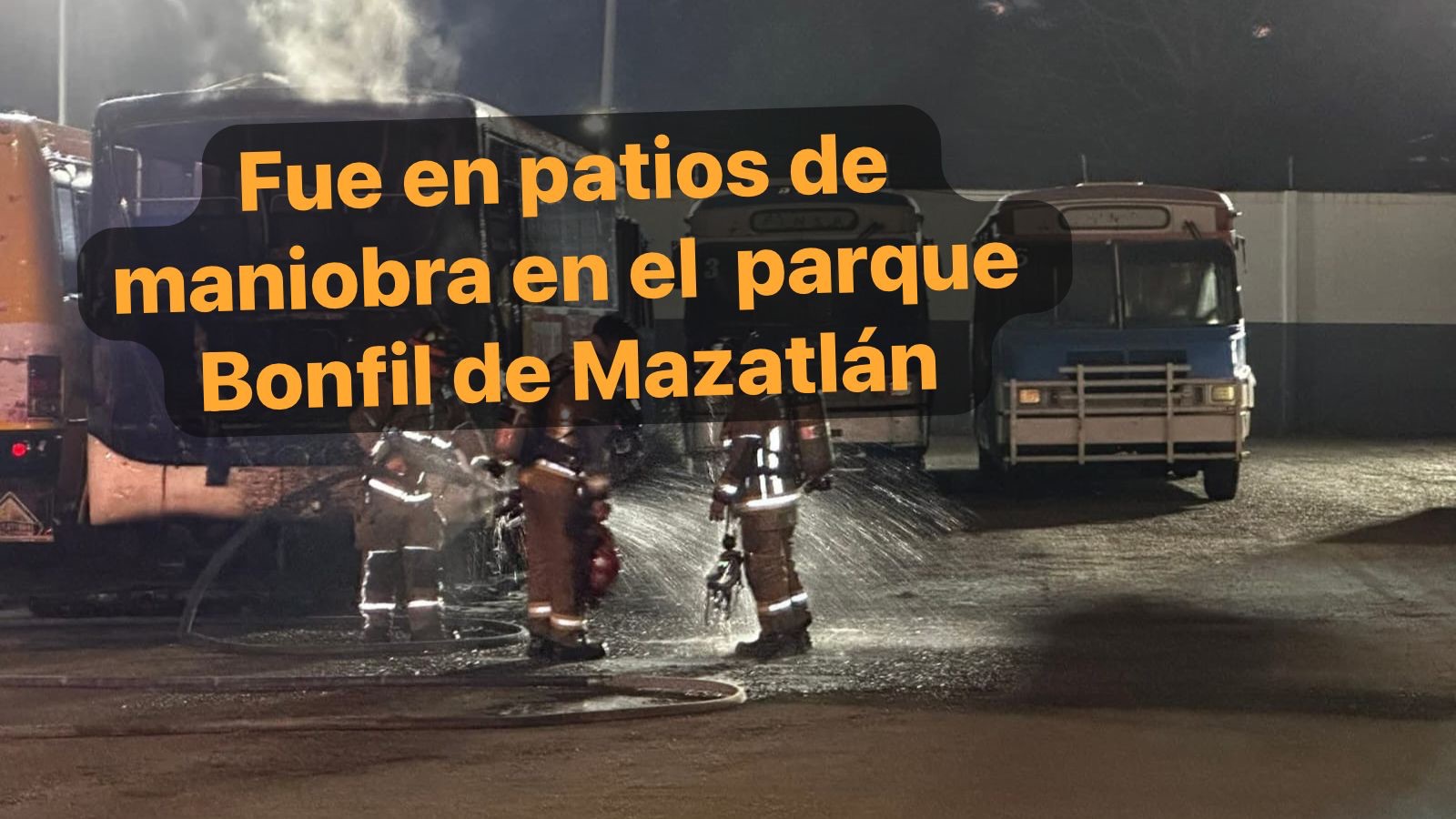 Mazatlán, Sin., 6 dic. 2025. — Elementos del Cuerpo de Bomberos Mazatlán, en coordinación con personal de Protección Civil Municipal, activaron los protocolos de atención tras recibir el reporte del incendio de un camión de personal estacionado en un patio de maniobras del Parque Industrial Alfredo Bonfil.