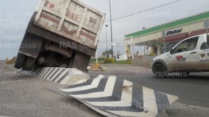 Luego de esquivar un automóvil un camión de volteo termino en el muro de contención del puente a desnivel de la salida Sur de Mazatlan.