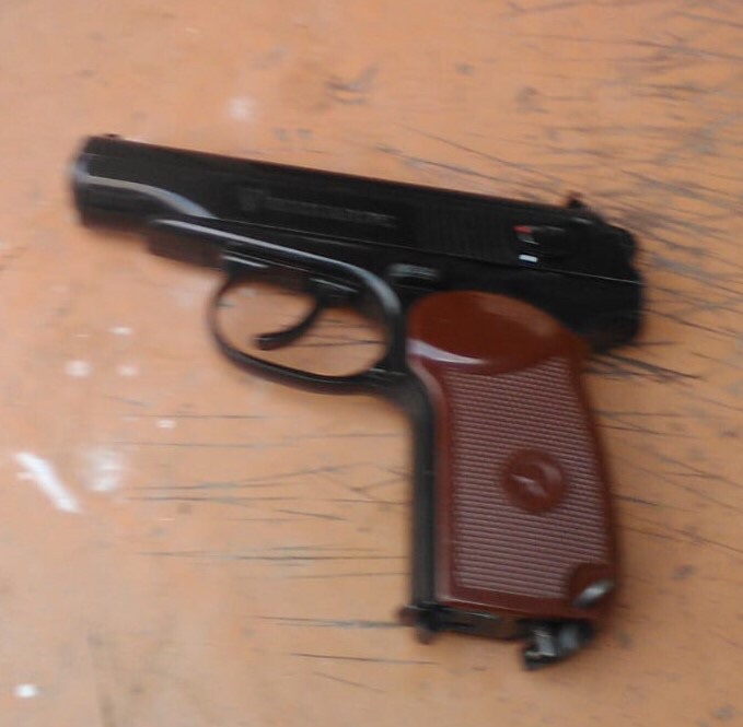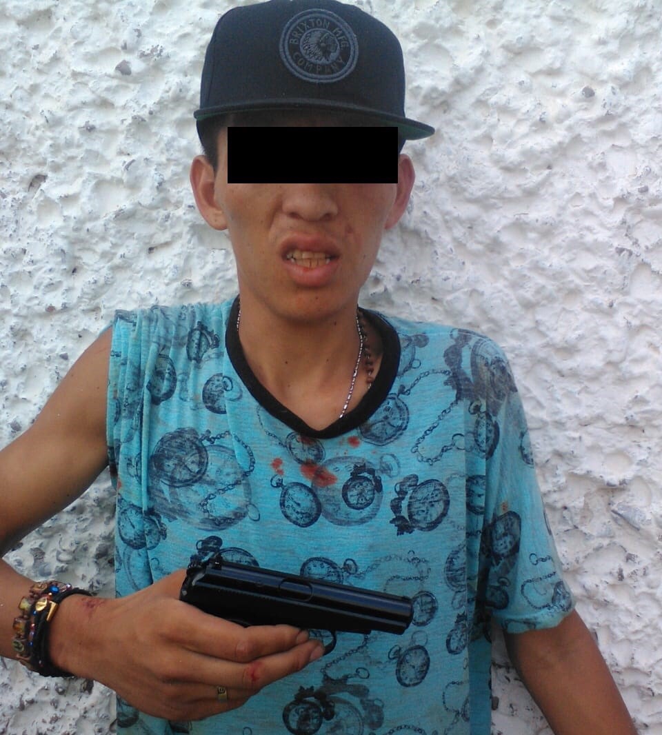 Los agentes le encuentran una pistola de diábolos color negro con cachas café marca Macarov por lo que proceden a someterlo y asegurar el arma.