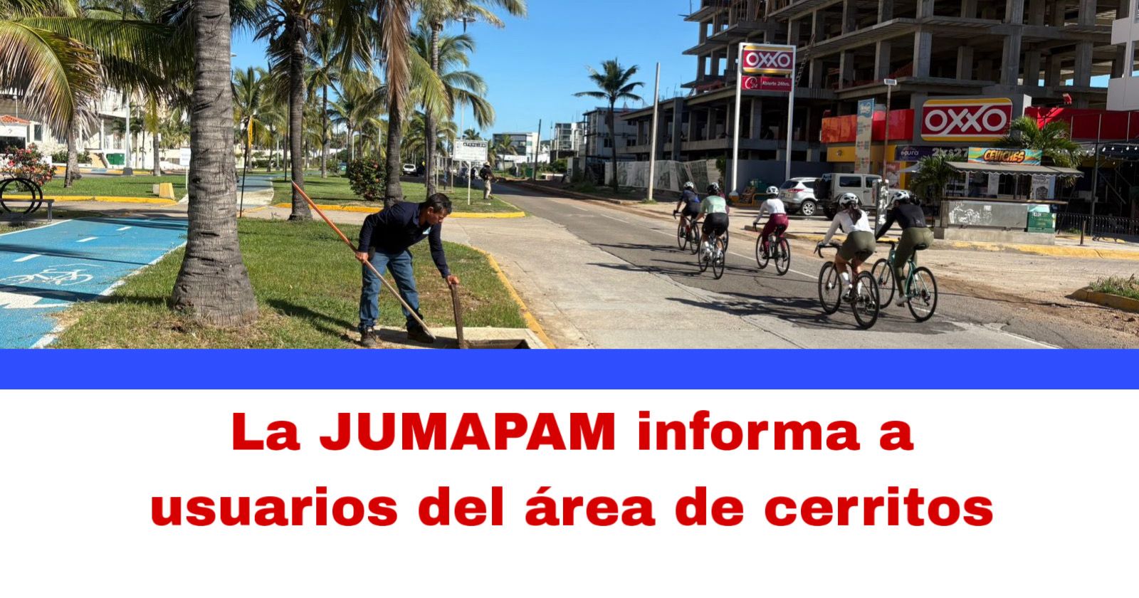 Mazatlán,Sin.,sept. 2025.-11 La JUMAPAM informa a los usuarios del área de Cerritos, que derivado de una fuga de agua potable que se registró este jueves 11 de septiembre en una línea de 12 pulgadas de diámetro, por Avenida la Marina y Sábalo-Cerritos, a la altura de las Oficinas de Marina Mazatlán, la Coordinación de Distribución de la Gerencia de Operación del organismo operador, cerró válvulas para que el Distrito Playas pueda realizar los trabajos de reparación, por lo que el servicio estará restringido desde las 10:00 a.m hasta las 3:00 p.m.