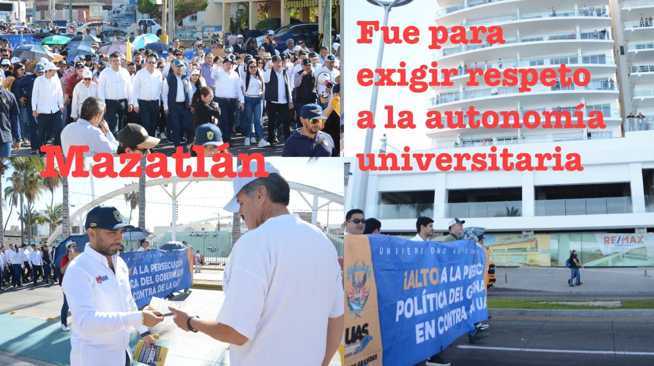La manifestación encabezada por el Encargado del Despacho de Rectoría, doctor Robespierre Lizárraga Otero, partió del Polideportivo de la UAS rumbo a la Facultad de Ciencias del Mar (FACIMAR) por el malecón, donde miles de visitantes fueron testigos y conocieron la persecución política del Gobernador Rubén Rocha Moya, que le quiere quitar la Autonomía a la UAS y que encabeza un gobierno totalitario.