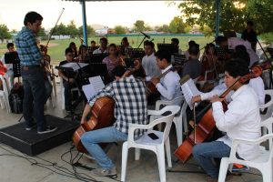 Como parte de su gira por la República Mexicana, la Orquesta Juvenil de Cámara “Lunga Konzort” que dirige el maestro Armando López llegó la tarde de este jueves a la colonia Flores Magón y regaló a sus habitantes un entrañable recital al aire libre.