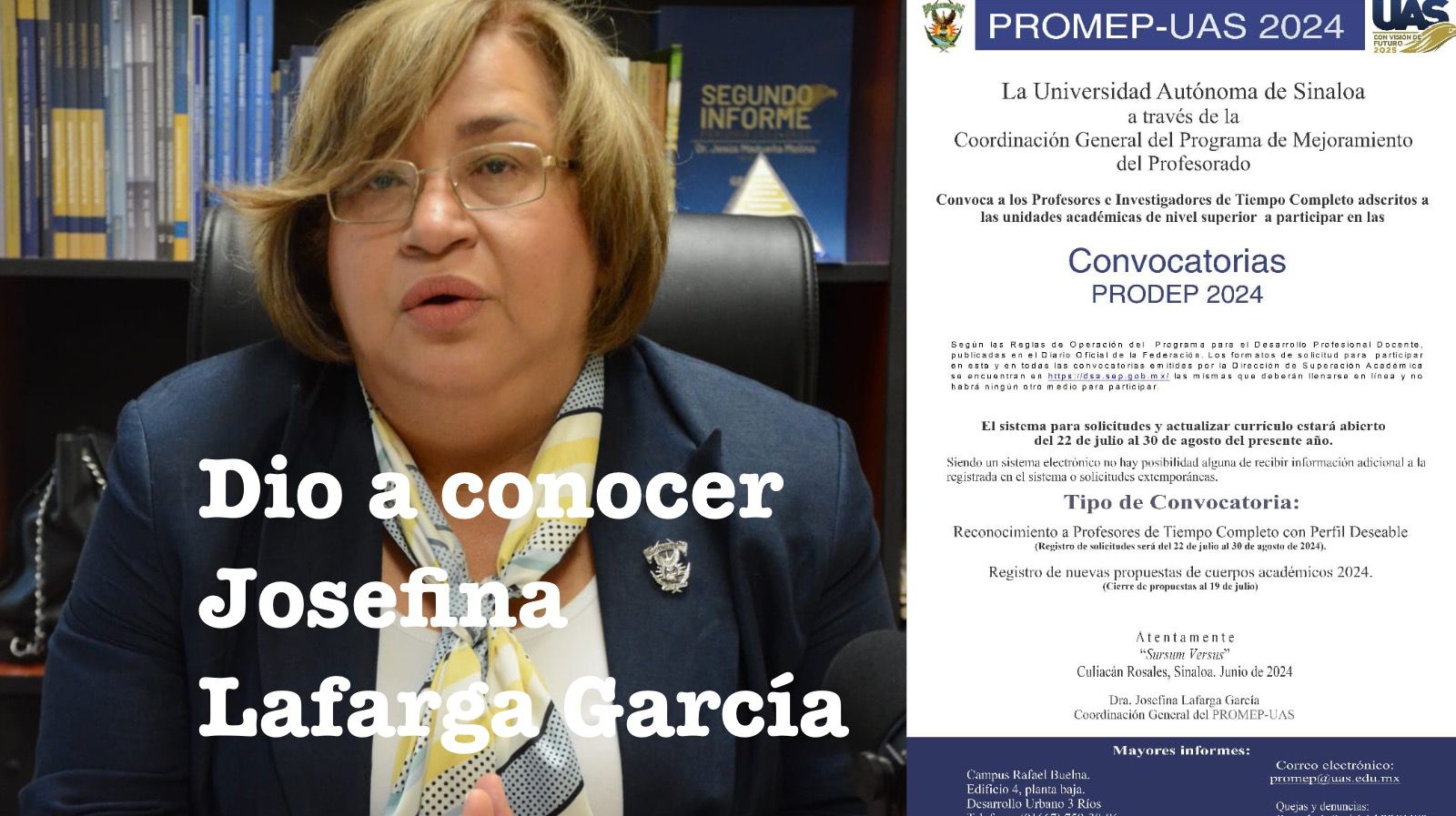 Culiacán, Sin., junio 28 del 2024.-La Coordinación General del Programa de Mejoramiento del Profesorado (PROMEP) está convocando a los profesores e investigadores de tiempo completo del nivel superior de la Universidad Autónoma de Sinaloa (UAS) a participar en las convocatorias del Programa para el Desarrollo Profesional Docente (PRODEP) 2024. Estas convocatorias incluyen el reconocimiento a profesores de tiempo completo con perfil deseable y el registro de nuevas propuestas de cuerpos académicos (CA), dio a conocer la doctora Josefina Lafarga García.