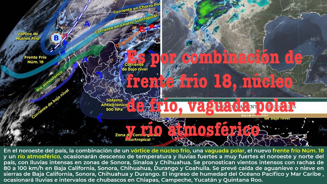 México; viernes 31 de diciembre del 2021.- Durante este día en el noroeste del país, la combinación de un vórtice de núcleo frío, una vaguada polar, el nuevo frente frío Número 18 y un río atmosférico, ocasionarán descenso de temperatura y lluvias fuertes a muy fuertes sobre entidades del noroeste y norte de México, con lluvias puntuales intensas en zonas de Sonora, Sinaloa y Chihuahua.