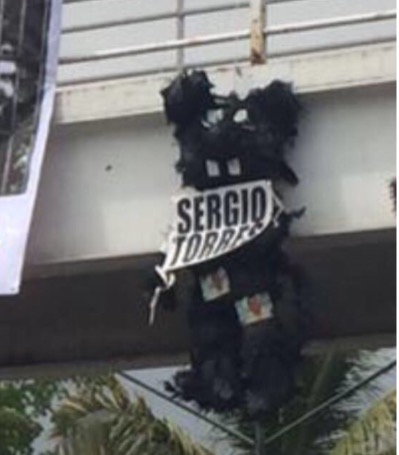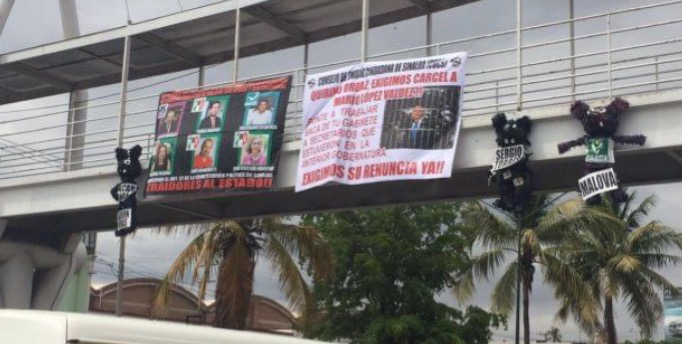 “Sr. Gobernador Quirino Ordaz Coppel, le pedimos tome cartas en el asunto en el millonario faltante de la administración pasada malovista, hay que seguir el ejemplo del gobernador de Veracruz, ya que denunció a Duarte”, se leía en una manta que pendía del puente afuera del congreso junto a dos enormes ratas, una de Malova y la otra de Sergio Torres.