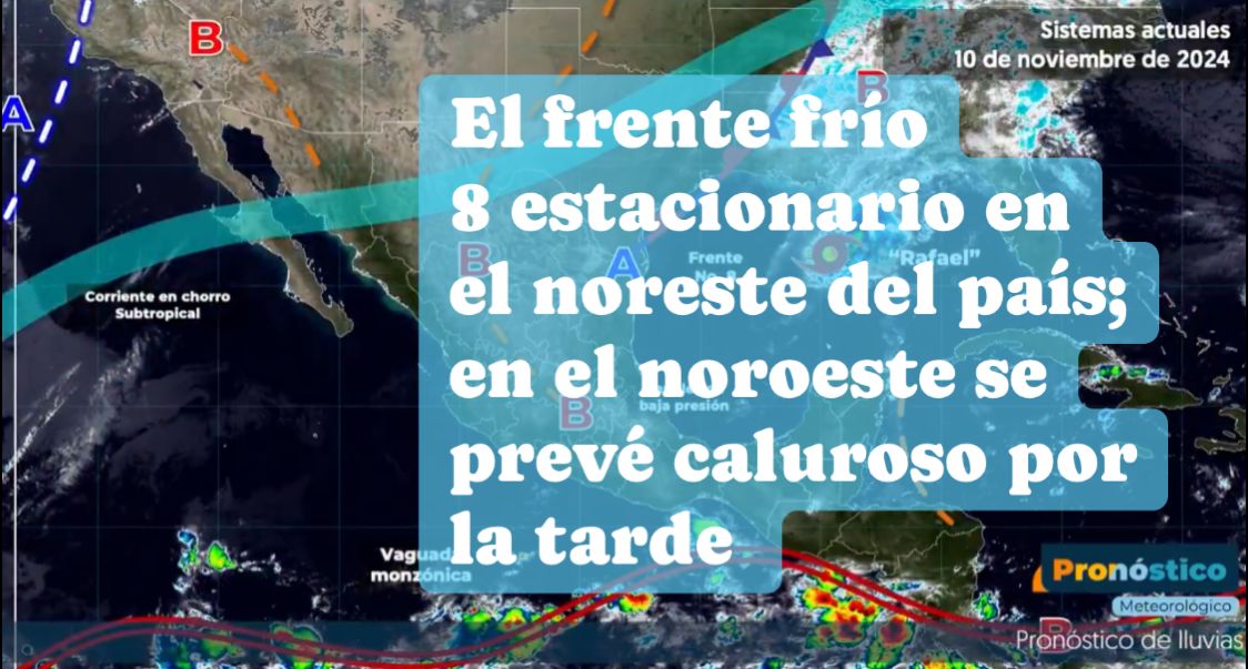 México,10 de Nov. 2024.-Hoy, el frente No. 8 se extenderá con características de estacionario sobre el noroeste del golfo de México, interaccionará con la corriente en chorro subtropical, ocasionando lluvias aisladas en Nuevo León, Tamaulipas y San Luis Potosí, además de fuertes y rachas de viento en la Mesa del Norte y la Mesa Central.