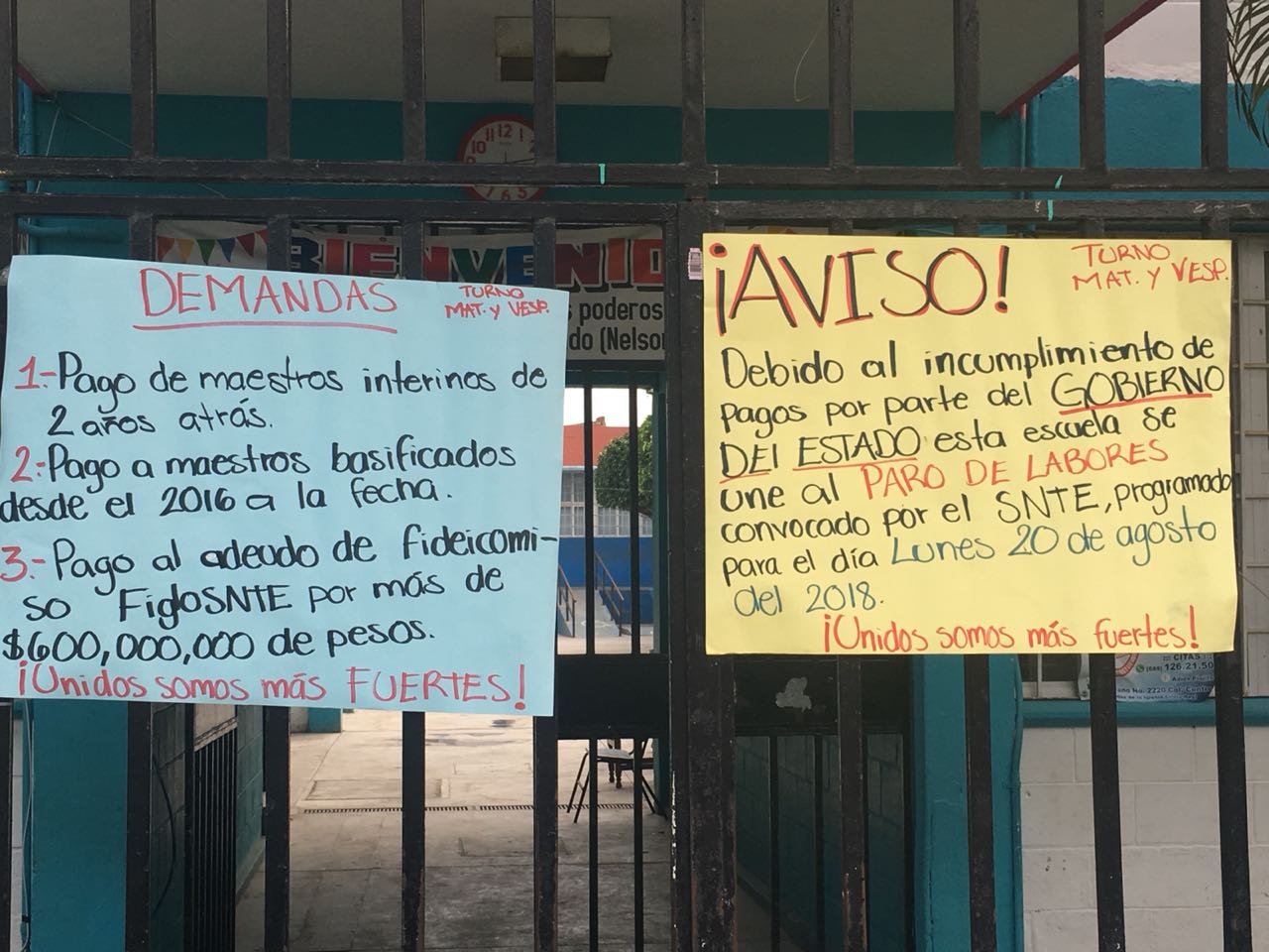 En los avisos colocados en las puertas de menciona que piden al gobierno de Quirino Ordaz el pago a maestros interinos del 2016 a la fecha, el pago de basificados desde dos años atrás, pago al adeudo del fideicomiso Figlosnte por mil 600 millones, así como renegociación de descuentos vía nómina.