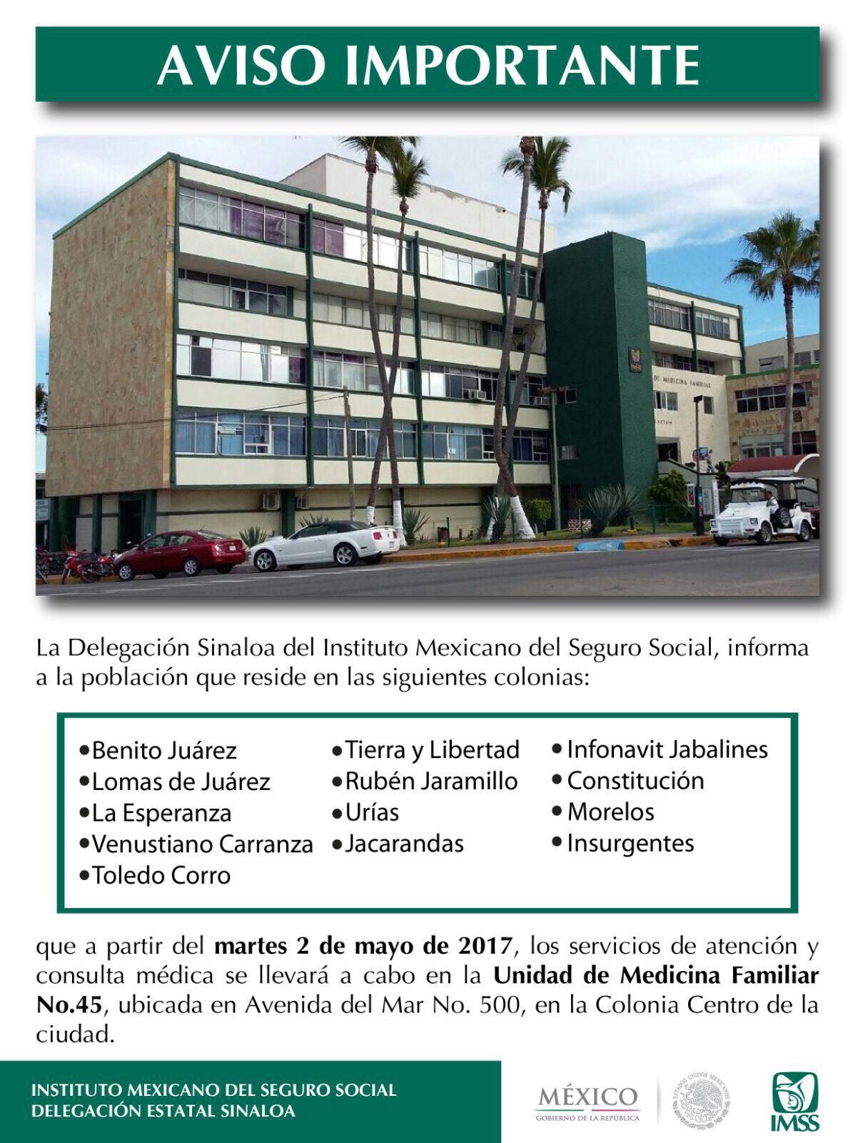 En un aviso de la página oficial, la delegación del IMSS en Sinaloa dio a conocer que los que se trasladan hacia la Unidad de Medicina Familiar numero 45 son los que habitan en Lomas de Juárez, Benito Juárez, Esperanza.
