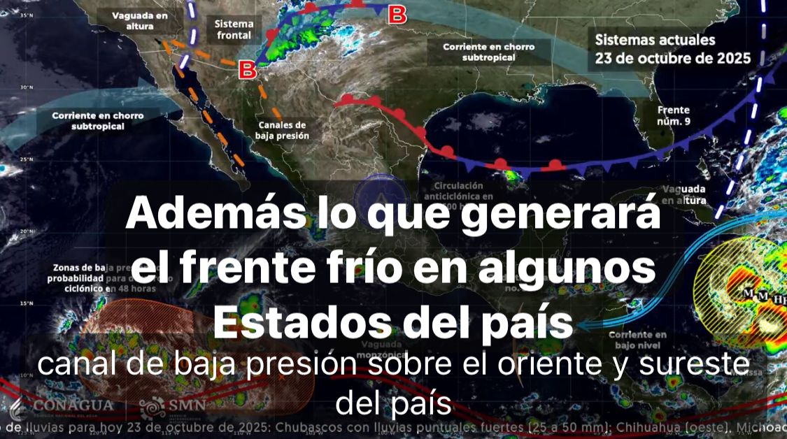 Por otra parte, la corriente en chorro subtropical y una vaguada en altura sobre el noroeste y norte del país, en interacción con inestabilidad atmosférica y la aproximación de un nuevo frente frío a la frontera norte de México, ocasionarán rachas de viento, lluvias y chubascos con descargas eléctricas en las regiones mencionadas, además de lluvias puntuales fuertes en Chihuahua.