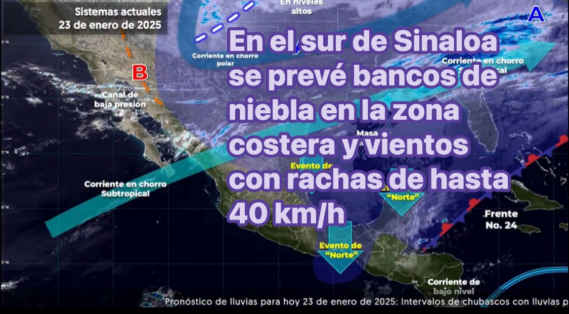 Pacífico Sur: En el transcurso del día, cielo despejado a medio nublado en Guerrero, medio nublado a nublado en Oaxaca y nublado en Chiapas. Bancos de niebla al amanecer en costas de Nayarit, costa norte de Jalisco y costa oriental de Michoacán. Por la mañana, ambiente fresco, siendo frío con temperaturas de 0 a 5 °C en sierras de Guerrero y Chiapas, muy frío en zonas altas de Oaxaca y templado en costas. Probabilidad de lluvias aisladas matutinas en zonas de Oaxaca y Chiapas. Durante la tarde, ambiente templado a cálido, siendo caluroso en zonas costeras; lluvias puntuales fuertes con descargas eléctricas en Oaxaca y Chiapas, las cuales podrían aumentar el nivel de ríos y arroyos, y generar deslaves e inundaciones. Evento de “Norte” de 40 a 60 km/h con rachas de 70 a 90 km/h en el istmo de Tehuantepec y de igual intensidad con oleaje de 1 a 3 metros de altura en el golfo de Tehuantepec.