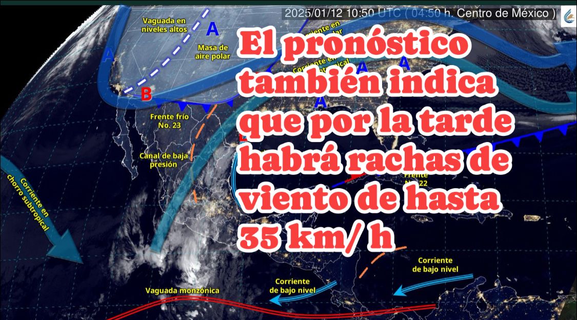Por su parte, el nuevo frente frío No. 23 y la masa de aire polar asociada, se desplazarán sobre el noroeste, norte y noreste de la República Mexicana, generando vientos fuertes a muy fuertes con posibles tolvaneras, además de mantener el ambiente frío a muy frío en las regiones mencionadas.