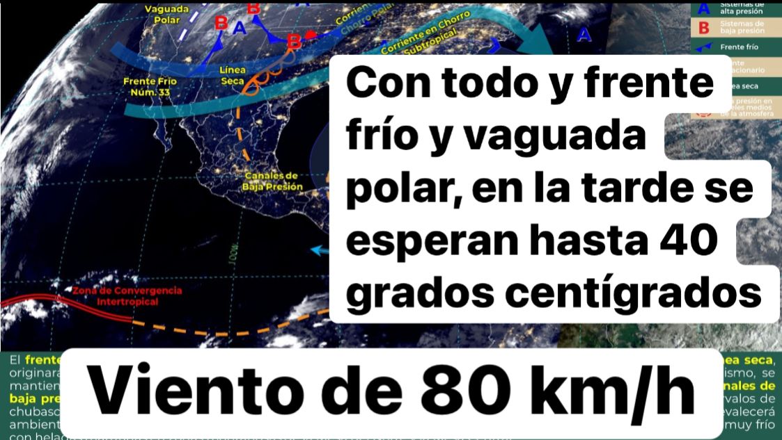 Pacífico Norte: Cielo parcialmente nublado con probabilidad de lluvias aisladas en Sonora, resto de la región sin lluvias. Ambiente muy frío con heladas al amanecer en sierras de Sonora. Por la tarde, ambiente cálido en Sonora y muy caluroso en Sinaloa. Viento de componente oeste de 20 a 35 km/h en la región con rachas de 60 a 80 km/h y tolvaneras en Sonora.