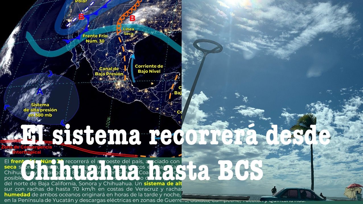 México; febrero 16 del 2022.- Este día, el frente frío Número 30 recorrerá el noroeste del país y se extenderá desde el norte de Chihuahua hasta el sur de Baja California Sur y, asociado con una vaguada polar, la corriente en chorro subtropical y una línea seca sobre Coahuila, favorecerán lluvias y chubascos en Baja California, Sonora y Chihuahua, rachas de viento de 100 a 120 km/h en Chihuahua y Durango, de 80 a 100 km/h en Sonora, Coahuila y Zacatecas, de 60 a 80 km/h en San Luis Potosí y Aguascalientes, dichos vientos con posibles tolvaneras.