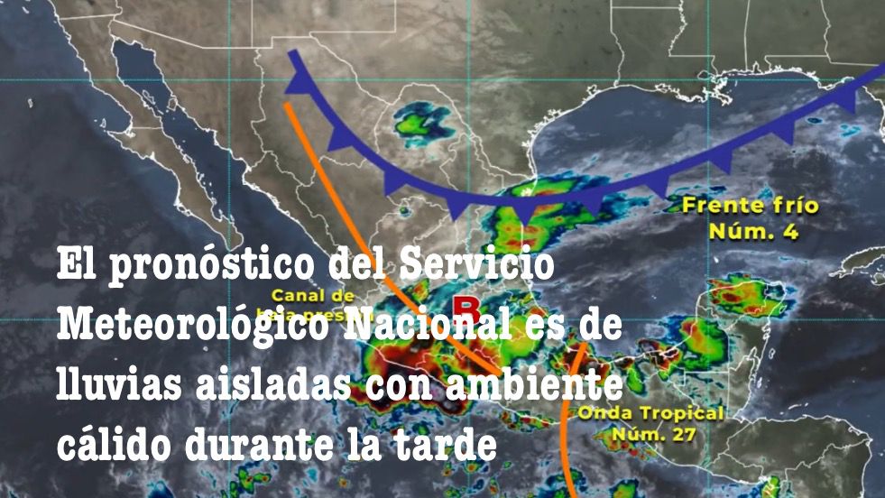 Pacífico Norte: Cielo medio nublado durante el día, lluvias aisladas en Sinaloa y sin lluvia Sonora. Ambiente fresco a templado por la mañana, frío en zonas serranas de Sonora. Ambiente vespertino cálido a caluroso. Viento de dirección variable de 10 a 25 km/h con rachas de 50 a 70 km/h en Sonora.
